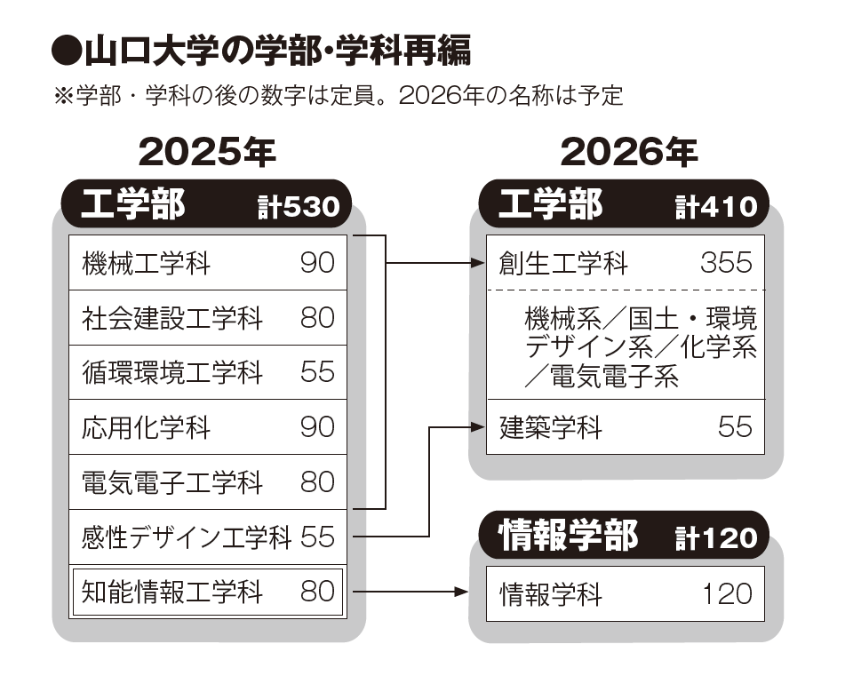 既存の学部で複数の学科を整理するのが最近の傾向だ。北見工業大‐工が2→1学科、信州大‐工が5→1学科、名古屋市立大‐芸術工が3→1学科、兵庫県立大‐工が3→1学科、山口大‐工が6→2学科、九州工業大‐工が6→1学科、同‐情報工が5→1学科、熊本大‐文が4→1学科に統合・再編する。
