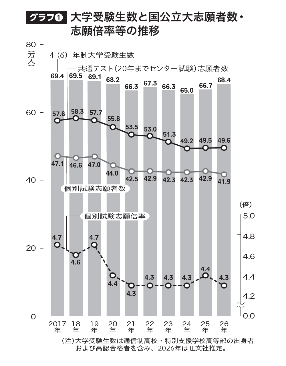 文部科学省の発表によると、2026年(以下、26年。他年度も同様)の国公立大一般選抜の確定志願者数は419,258人で、25年に比べ2.2%減(独自日程で入試を行う国際教養大・新潟県立大・叡啓大・芸術文化観光専門職大は集計に含まれない)。全募集人員(97,399人)に対する倍率(志願倍率)は4.3倍で、前年に比べ0.1ポイントダウンした(グラフ①)。
