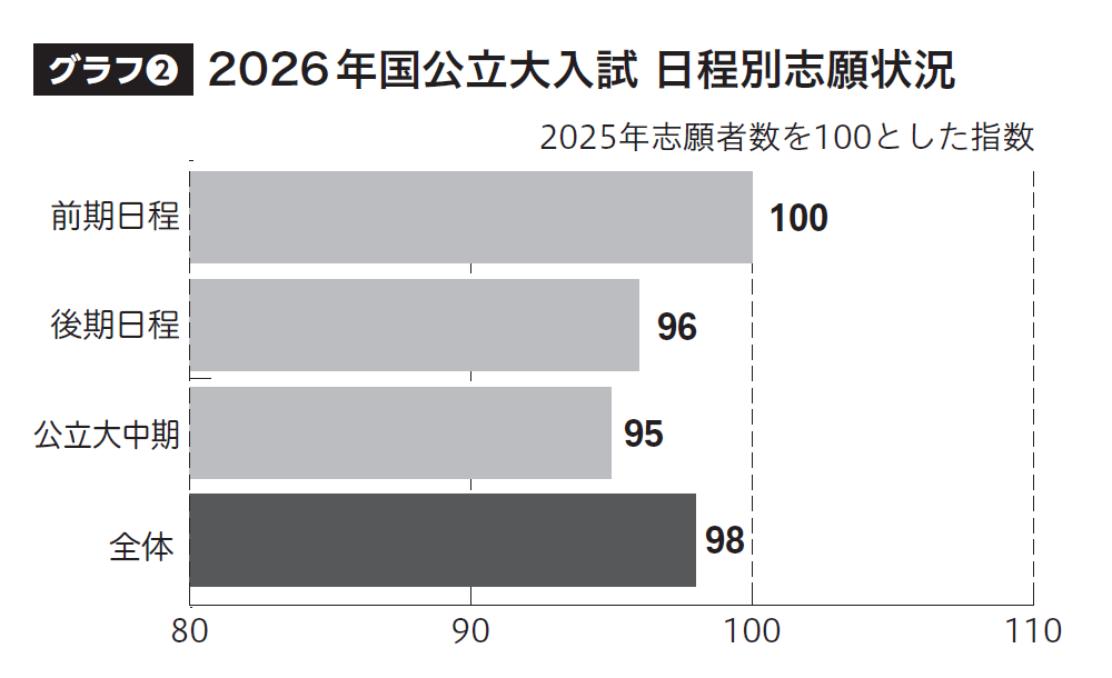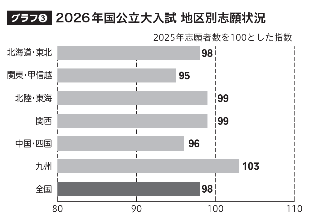 2026年国公立大入試について、人気度を示す「志願者動向」を分析する。大学受験生数は増加したものの、一般選抜の志願者数は前年に比べて約2%減。共通テストは難化し、学力最上位層以外の受験生は志望校変更の動きが見られた。