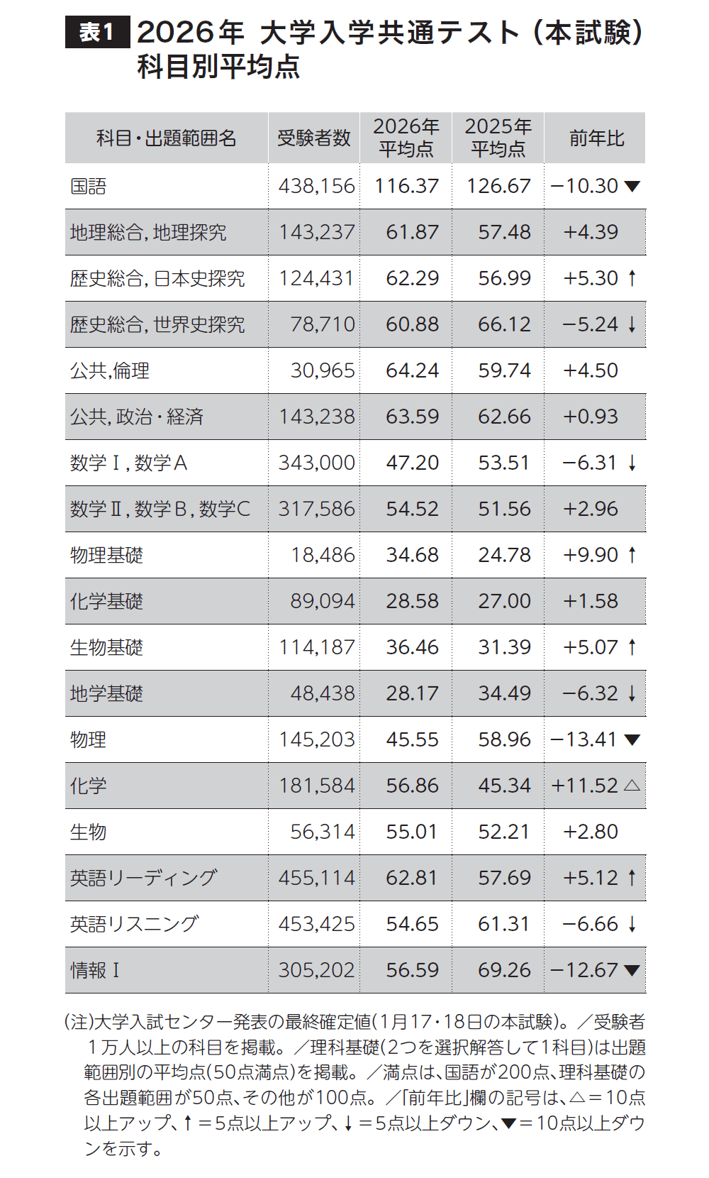 国語、「数学Ⅰ、数学A(以下、数学ⅠAと略)」、物理、英語リスニング、情報Ⅰなどが平均点ダウン。前年まで2年連続で対前年10点以上アップしていた国語は、26年は10.30点のダウンとなった。