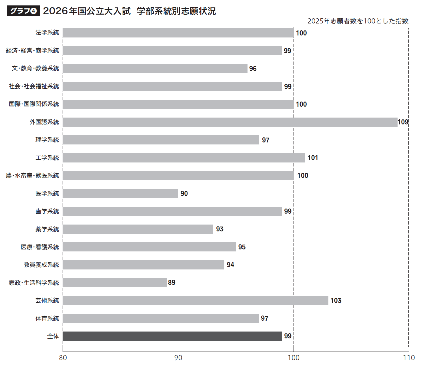 全体的に弱めの「文高理低」傾向だが、25年に比べて文理の差は小さくなっている。23年まではコロナ禍の影響で「文低理高」傾向で、24年と25年は就職事情の好転などを背景に「文高理低」だった。