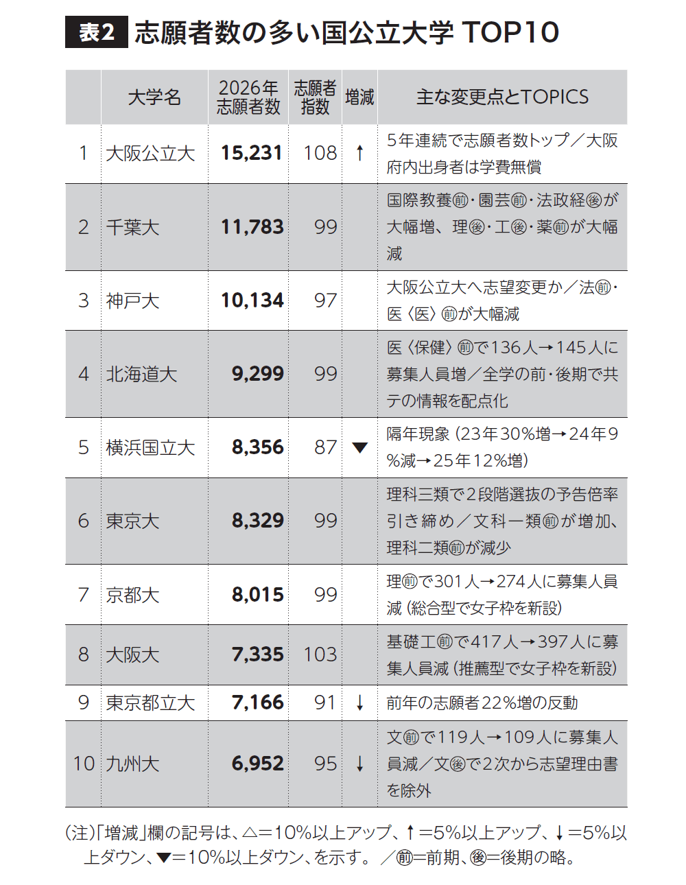 志願者最多の国公立大は5年連続で大阪公立大。26年までに府内出身者を対象に段階的に学費無償化する施策が志願者の安定確保につながり、志願者は8%増となった。また、筑波大(1%減)・千葉大(1%減)も堅調。