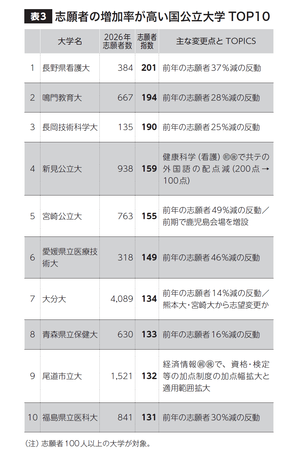表3では、志願者の増加率が高い順に上位10大学を示した。表2と異なり、地方公立大が7大学を占めるのが大きな特徴。前年に名を連ねた公立大は8大学で、共テ難化の影響を受けつつも根強い地方公立大人気が見て取れる。医療や看護、教育など単科大(1学部のみ)が7大学入っているのも特徴。1位の長野県看護大は志願者が2倍超に膨張。同校を含め、表3のうち8大学で前年の志願者大幅増の反動が出ている。