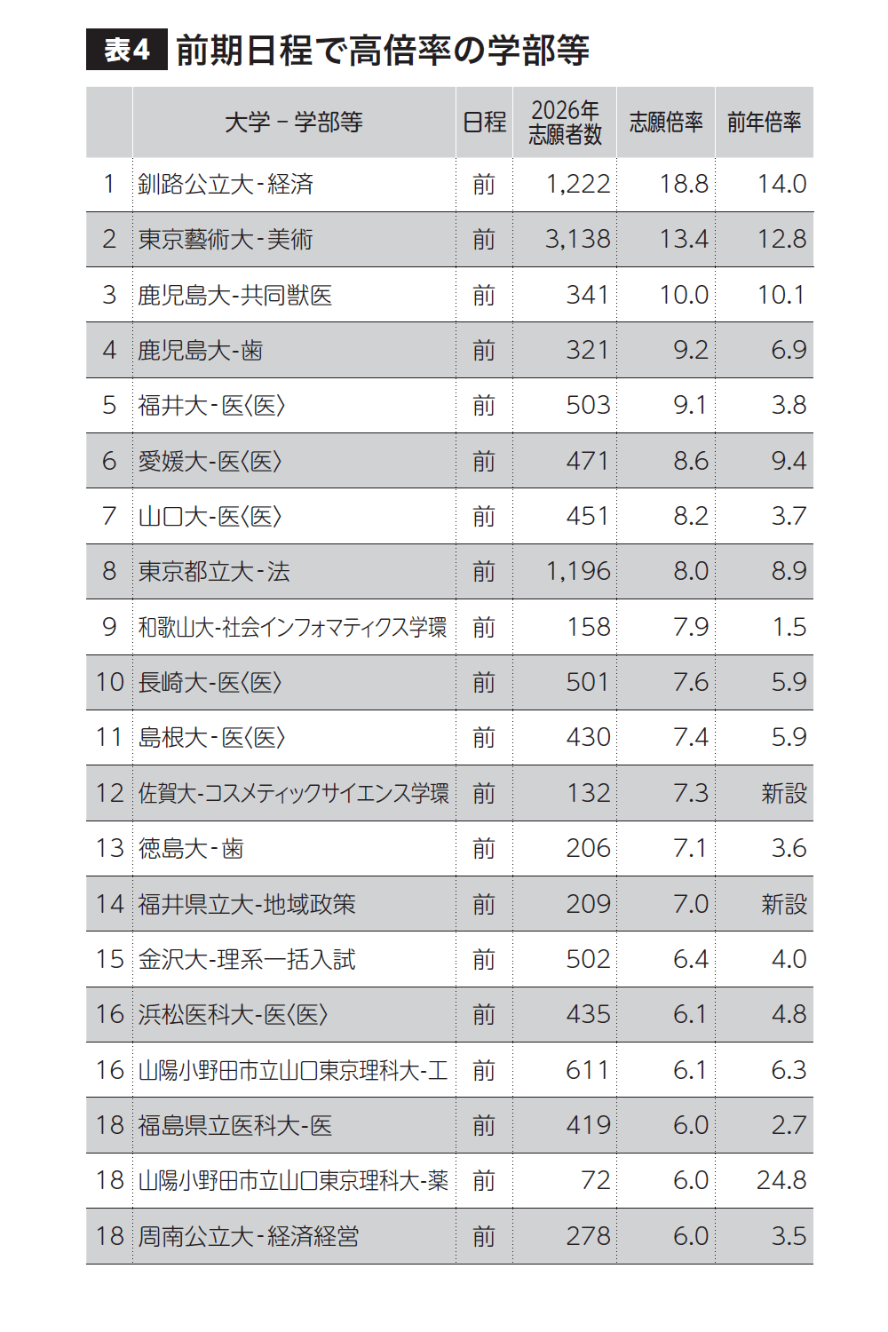 まず、表4・5の「高倍率の学部等」から見ていこう。前期では医学部医学科が目立ち、変わらない難関ぶりを物語る。その中で目を引くのは、新設の2学部等が入っていることだ。新たに開設された佐賀大‐コスメティックサイエンス学環と福井県立大‐地域政策が、受験生の人気を集めた。また、1位の釧路公立大‐経済、2位の東京藝術大‐美術、3位の鹿児島大‐共同獣医は、それぞれ前年よりひとつ順位を上げた。