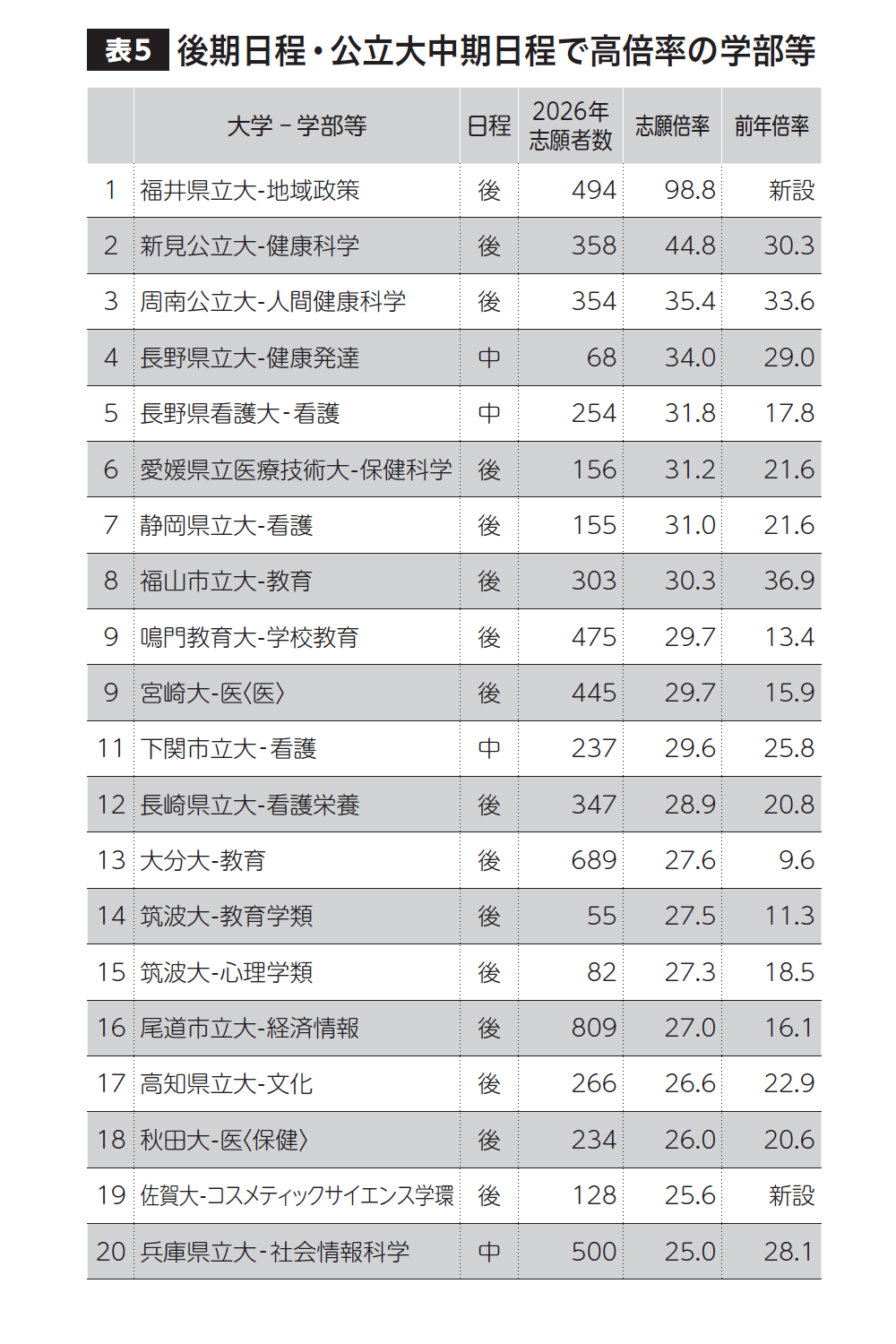 後期・中期および全体での最高倍率は、福井県立大‐地域政策【後】の98.8倍。後期・中期は募集人員が少なく、実施学部・学科も減っているため、前期以上の「超高倍率」になるが、欠席率の高さ(例えば後期の場合、前期の合格・入学手続者が欠席するので、志願者の約60%が欠席となる)を割り引いて考える必要がある。公立大は中期に加え、後期も国立大に比べ多く残っている。そのため、併願先の私立大が限られる大都市圏以外の地域では、志願者が集中することが多い。