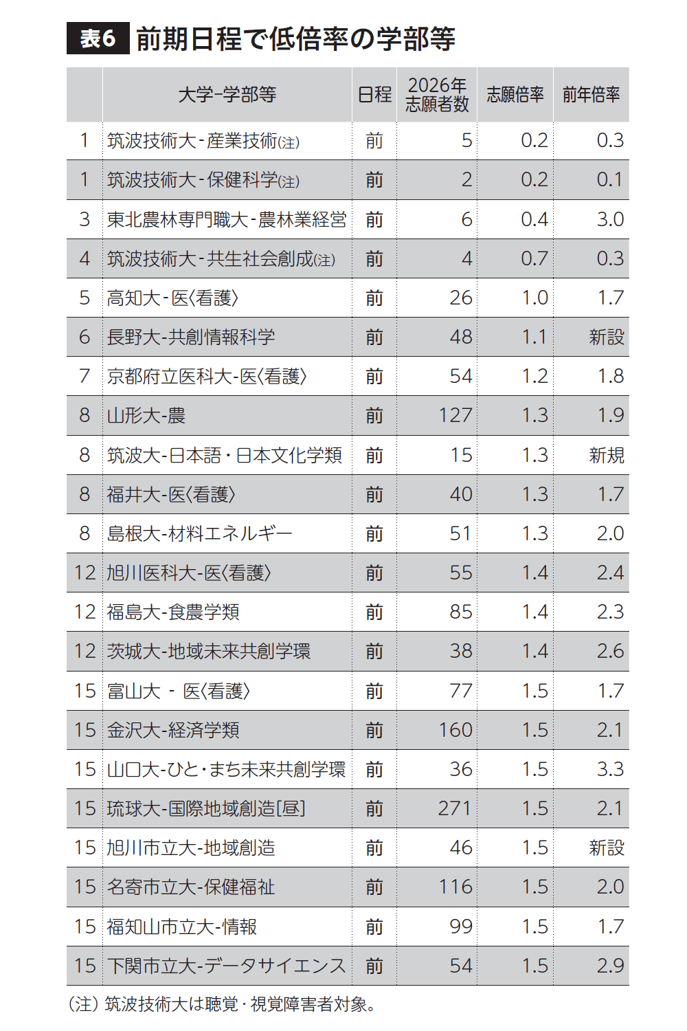 一方で、表6のように前期で志願倍率が1割台のケースもある。看護・医療系が目立つが、山形大‐農、福島大‐食農学類などの農学系も目を引く。そのほか、新設や開設間もないものも含めて、地域や情報を扱う学部が多いことにも注目したい。